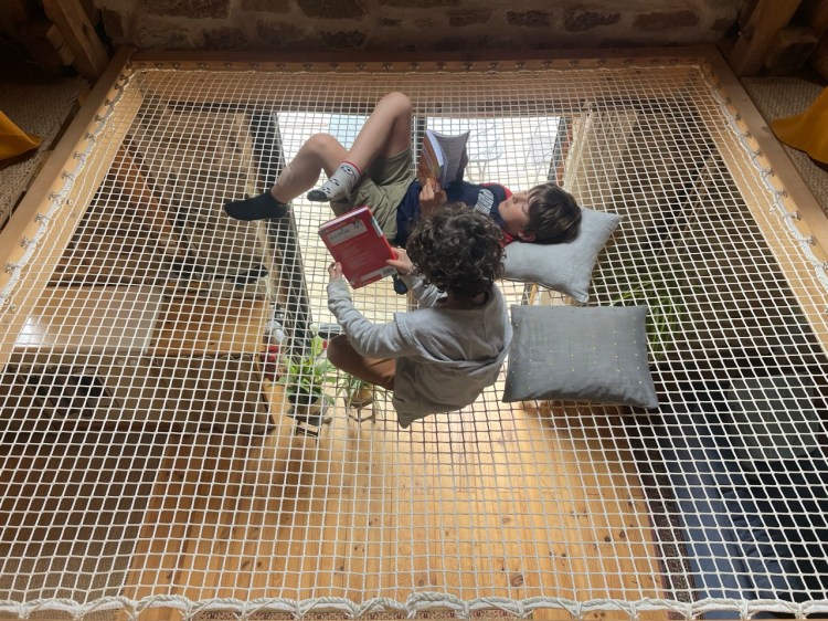 Au dernier étage on trouve deux mezzanines dans lesquelles sont installées deux chambres. L’une d’elle est équipée d’un lit King size (180 x 200), et l’autre comporte un lit double en 140 et un lit simple en 90. Les mezzanines sont reliées par une passerelle et un filet de catamaran sur lequel on peut marcher sans danger. Le filet laisse passer la lumière des vélux jusqu’au premier étage, mais c’est aussi un très agréable espace de repos pour lire ou faire la sieste…